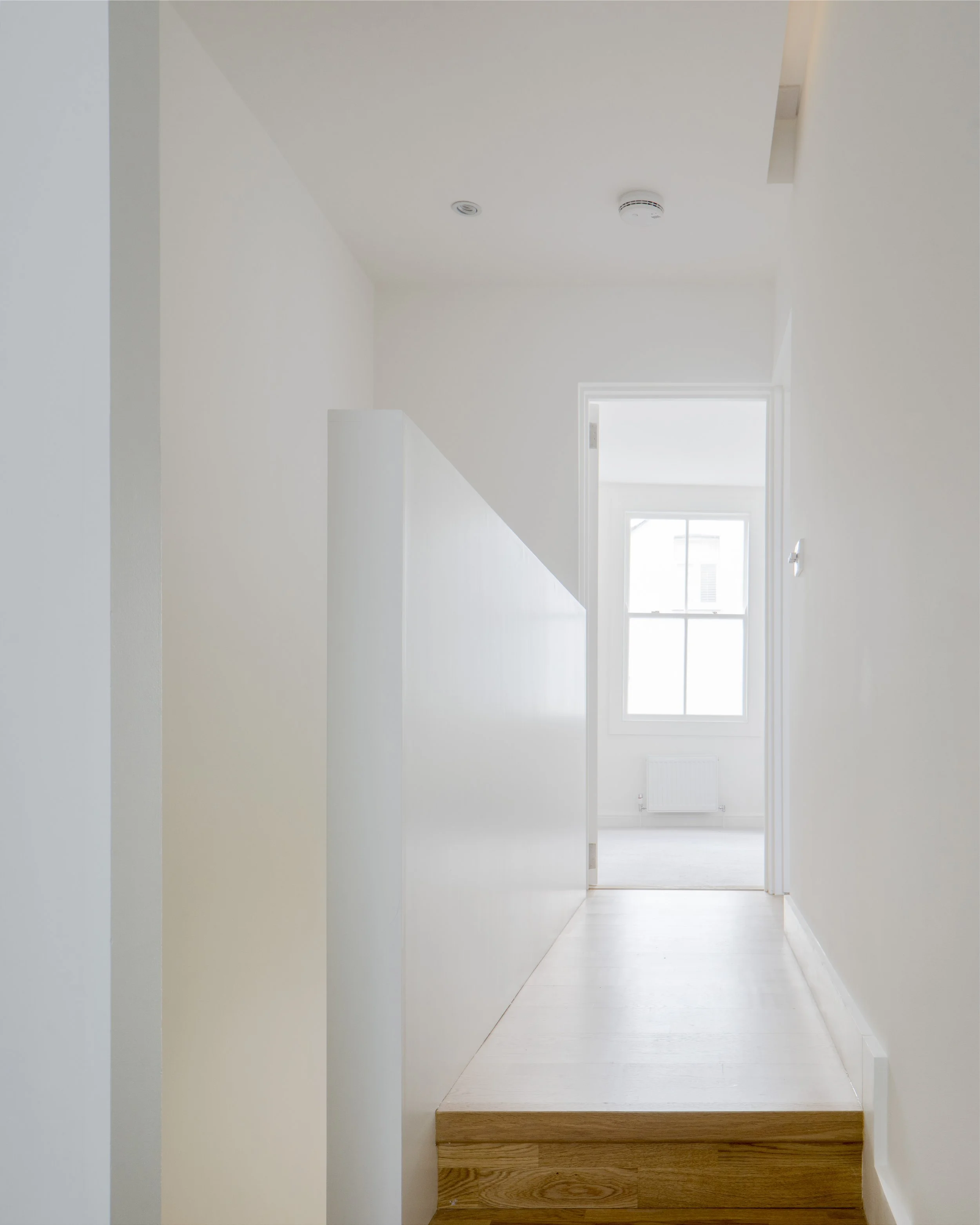 Transformation of a dilapidated reconfigured Victorian terrace house to create a spacious, light-filled modern family home, with sculptural free-flowing spaces. Creating long views through the house, this scheme has extensively remodelled the interior with a new side extension with skylight, back elevation, adjusted floor levels, removed walls and chimney breasts, and reorganised the circulation to maximise space and volume. Downstairs, the kitchen has been strategically located along one wall at the centre to allow for flexible use, whilst the floor has been lowered to garden level. Reconfiguring the stair, landing and doorway to the new generous bathroom upstairs has created an efficient layout with a separate utility-storage area, whilst allowing two well-proportioned bedrooms to be reinstated. The work has improved comfort and sustainability throughout.